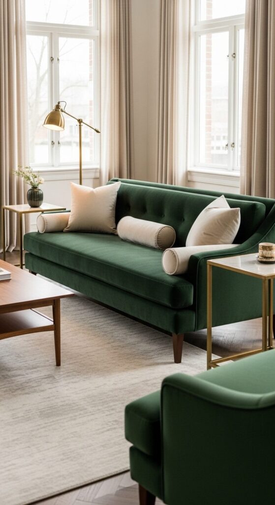 Imagine deep jewel tones coming alive through sumptuous velvet upholstery. A forest green velvet sofa anchors the room, its surface shifting between light and dark as you move around it.