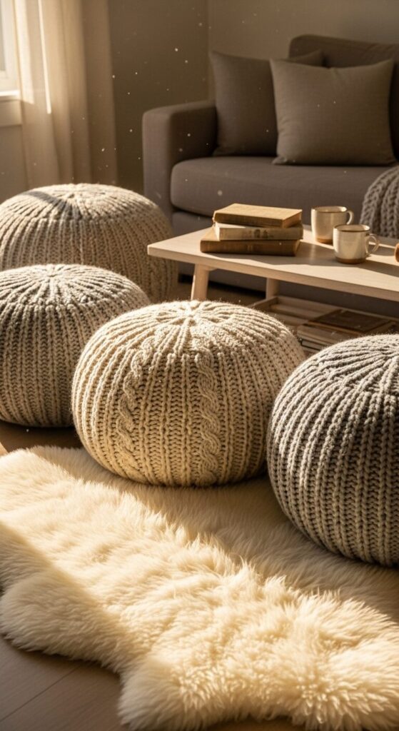 Chunky knit or cable-knit floor poufs in cream and gray tones invite people to sink down and get comfortable.