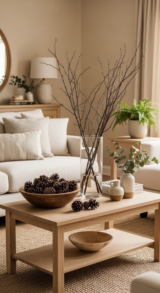A bowl filled with pinecones sits on the coffee table, bare branches in a tall vase create sculptural interest, and touches of evergreen add life without feeling overly festive.