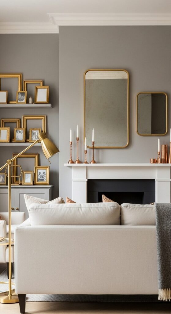A brass floor lamp stands beside the sofa, copper candle holders cluster on the mantel, and gold-framed mirrors bounce light around the room. The metallic elements feel warm rather than cold, adding sophistication without feeling formal.