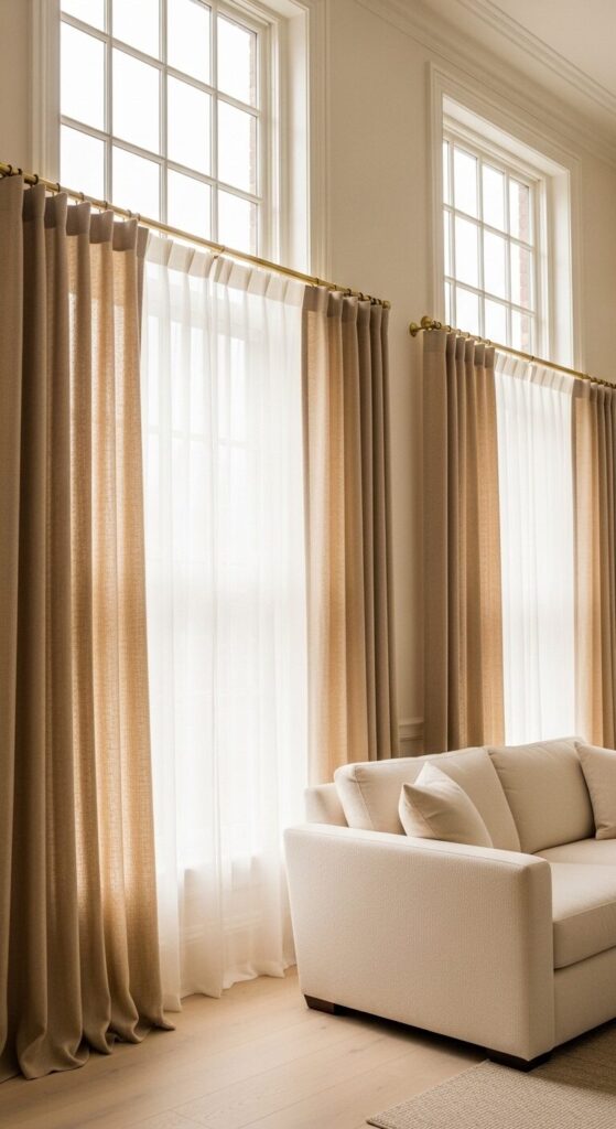 Imagine windows dressed in layers that create warmth and visual softness. Heavy linen curtains in natural oatmeal hang from brass rods, with sheer white panels underneath to filter harsh winter light.