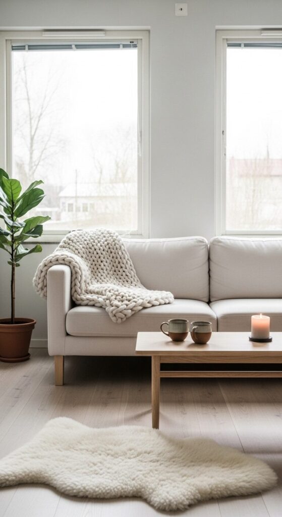 - Add ambient touches like textured rugs, oversized blankets, and layered window treatments for extra coziness
