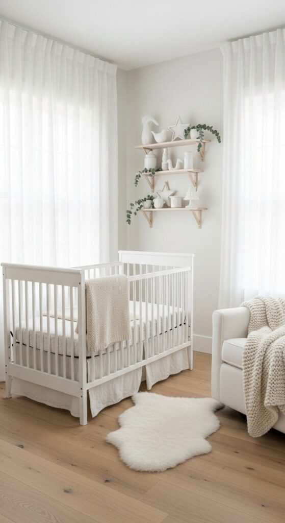 The crib stands dressed in soft linen, while a plush white rug pools underneath like a cloud. Natural light filters through sheer curtains, making everything feel airy despite the cozy intent.