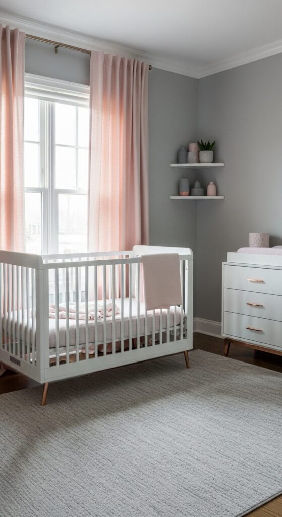 A gray upholstered crib or one painted in matte gray anchors the space, complemented by blush curtains that filter light into something rosy and gentle.