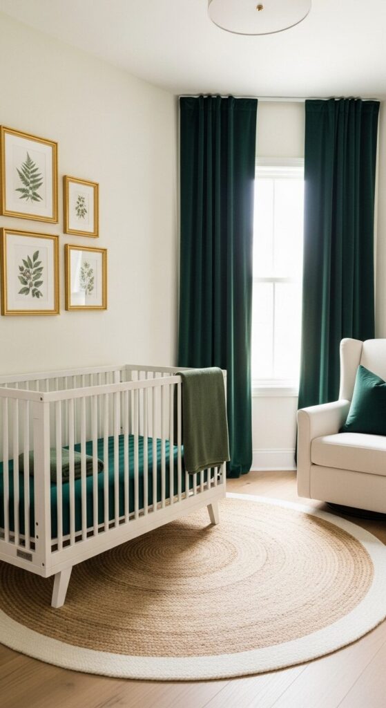 Pair it with ivory and gold for an elevated look — imagine an ivory crib with evergreen bedding, gold-framed botanical prints on the walls, and deep green velvet curtains pooling at the floor.