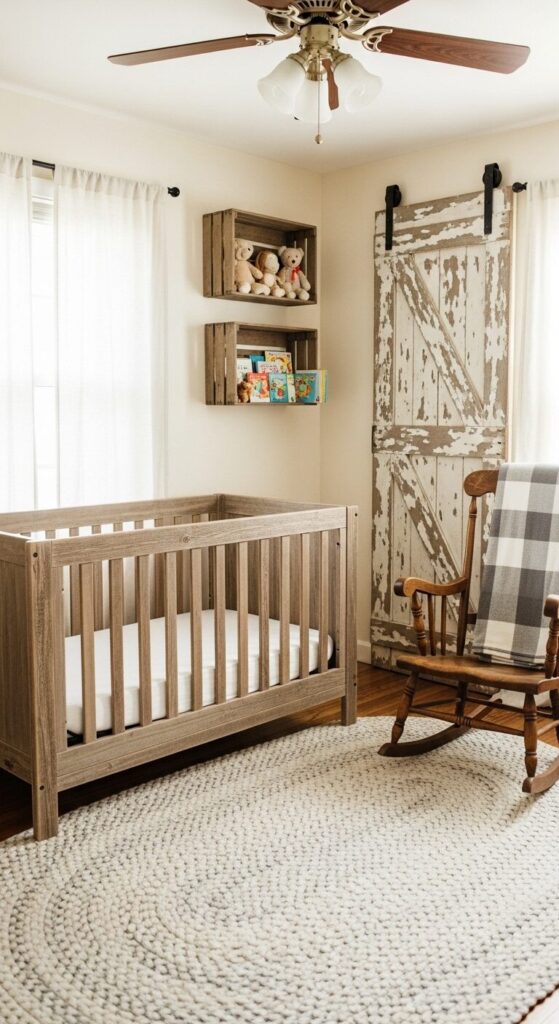 Weathered wood tones dominate — think barn doors repurposed as wall art or a crib crafted from reclaimed lumber.