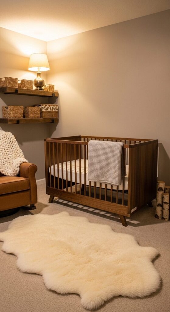 Create the Look: Balance dark furniture with lighter walls — if you have a dark wood crib, keep walls in soft taupe or cream. Add one large textural element like a sheepskin or faux fur rug.