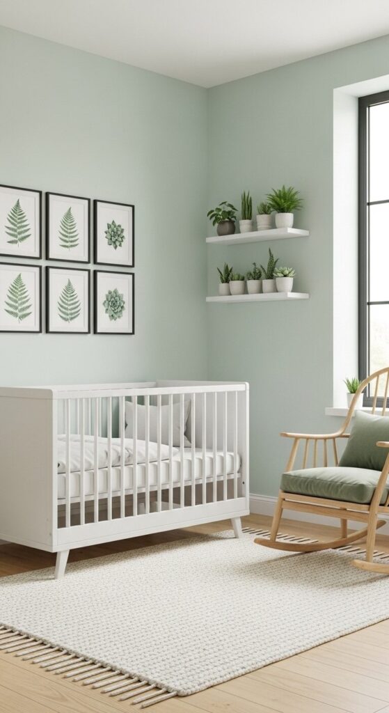 Imagine walls in the palest mint, a white crib surrounded by simple botanical prints, and touches of natural wood. Small potted plants on shelves bring life to the space year-round.