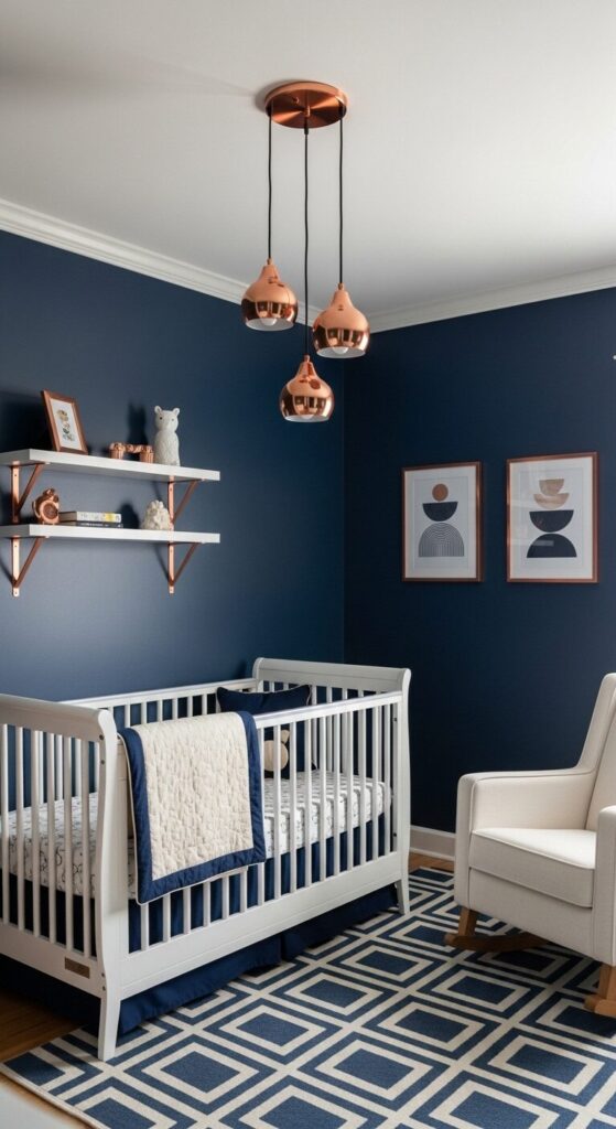 Deep navy walls make a bold statement when balanced with warm copper accents and plenty of white.