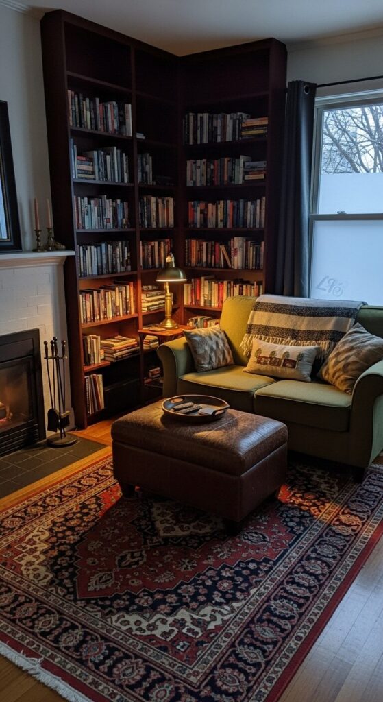 Mahogany shelves tower over an olive tufted loveseat, with a ruby and navy Persian rug and brass library lamp casting golden pools.
