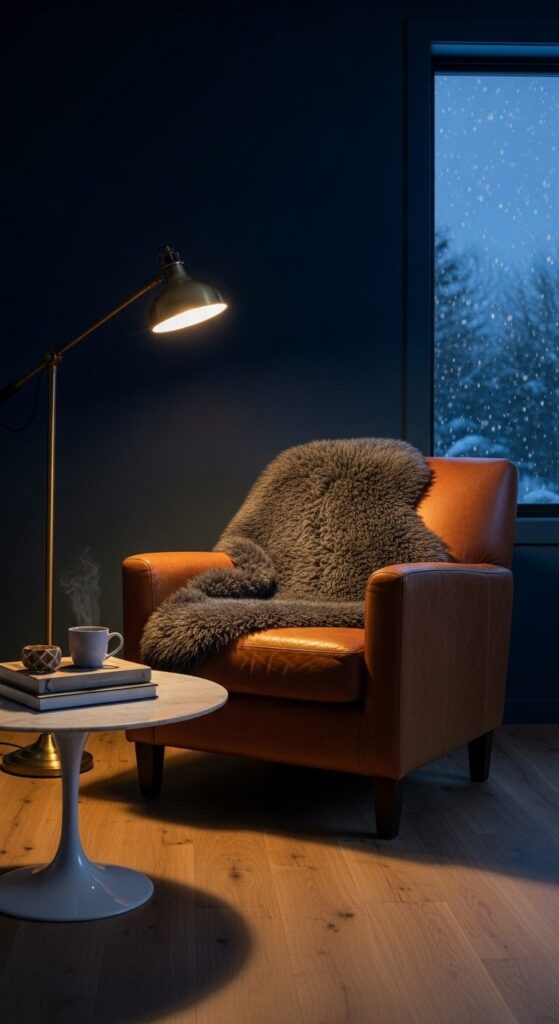 Navy walls drink in the light, making a cognac leather chair and brass lamp shine like stars. A charcoal sheepskin rug softens oak floors under a sleek marble table.