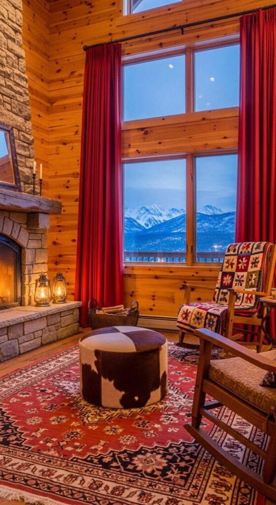 Knotty pine walls hug a stone hearth, with crimson plaid curtains and a cowhide ottoman on a Berber rug. It’s a cabin dream without leaving town.
