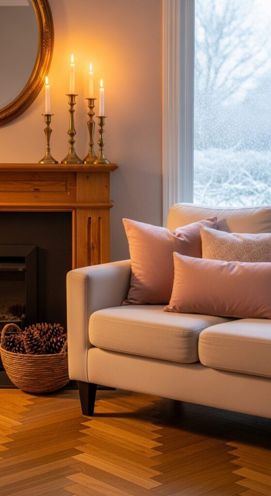 A cream linen loveseat glows under a mantel covered in brass candlesticks of all heights. Blush and gold pillows snuggle beside a basket of pinecones.
