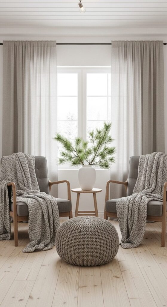 Pale birch chairs wear chunky cream cable-knit throws like sweaters. A woven oatmeal pouf sits ready for feet, and frosted pine branches in a simple vase nod to the snow outside.