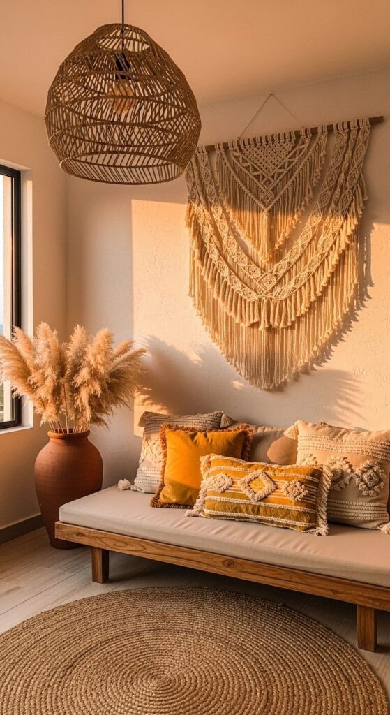 A macramé wall hanging frames a low teak sofa stacked with fringed pillows and mustard throws. Pampas spills from terracotta pots on a sisal rug.