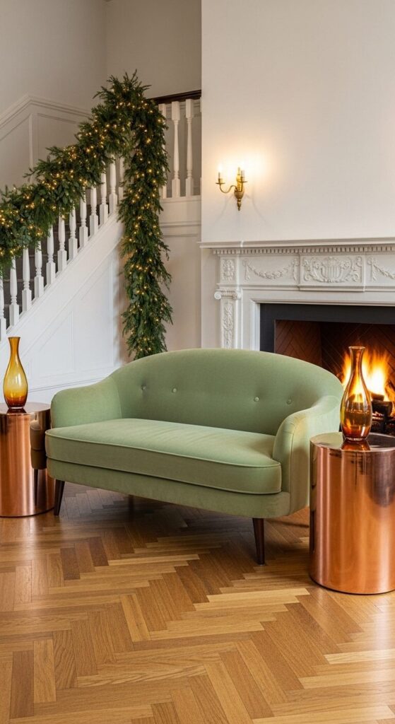 Hammered copper tables flank a sage velvet settee, with fresh evergreen garland along the picture rail. Amber glass catches firelight on herringbone floors.