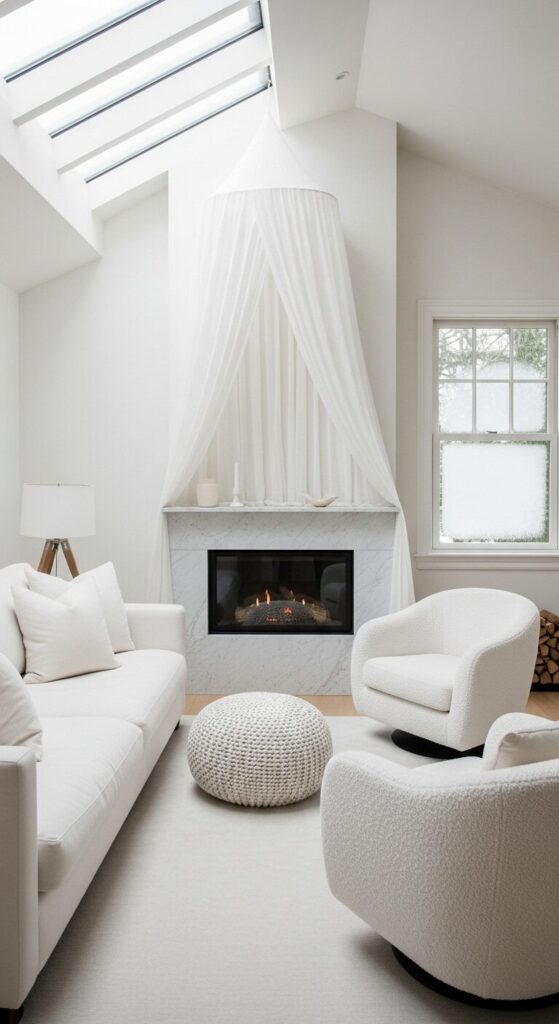 All white: sofa, boucle chairs, knit pouf, marble fireplace. One charcoal throw adds just enough contrast. It’s like sitting in a cloud.