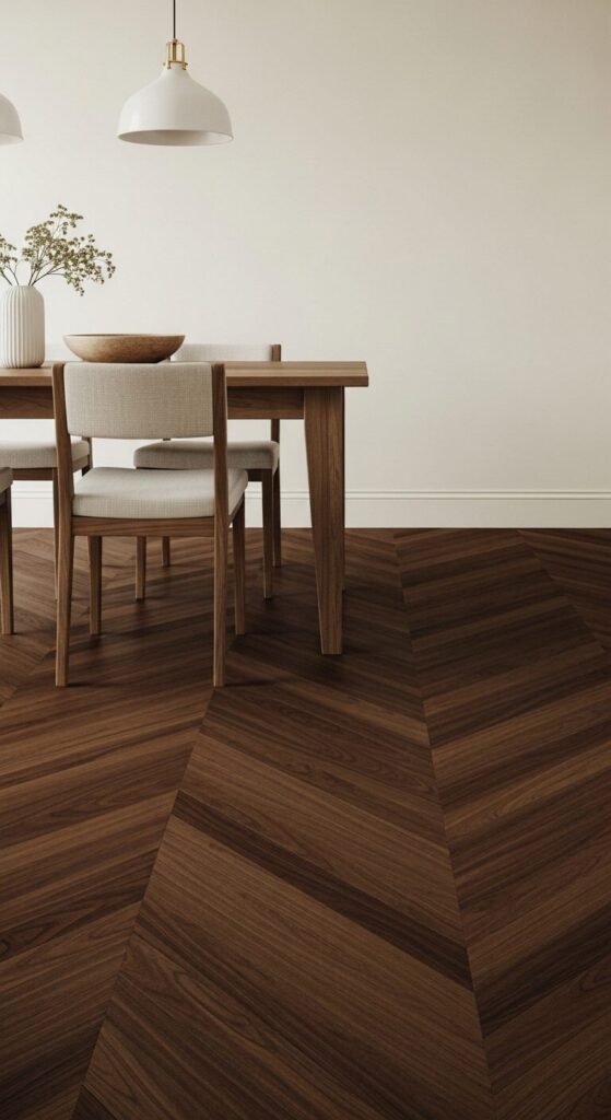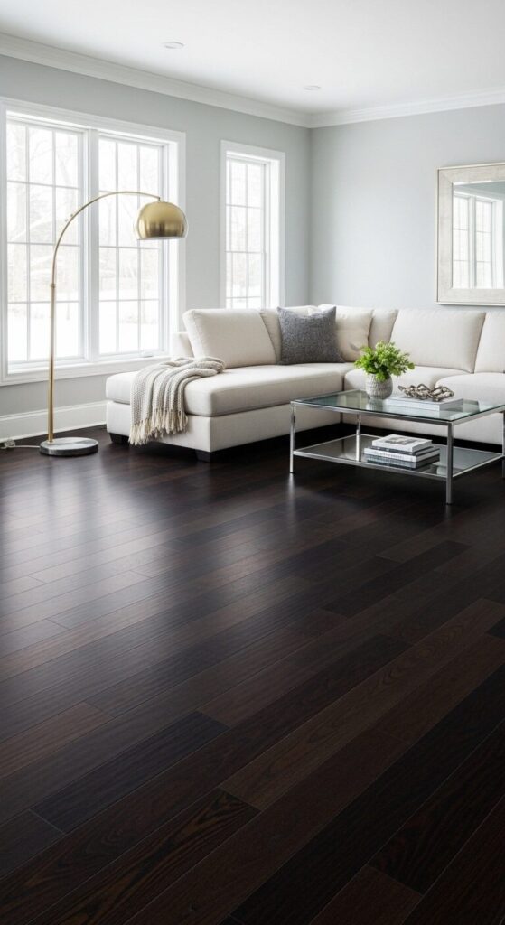 Bring This Style Home: Choose a dark espresso stain on oak or maple for durability. Balance the dramatic flooring with white or light gray walls, and incorporate metallic accents or light-colored furniture to prevent the space from feeling too heavy.