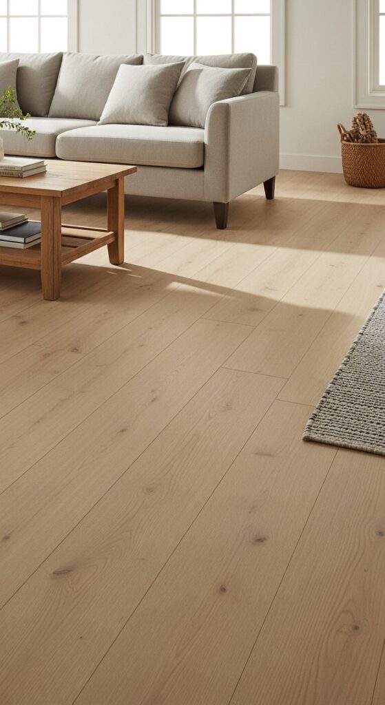 The soft, neutral palette catches morning light beautifully, creating gentle shadows between each plank that add depth without overwhelming the space.