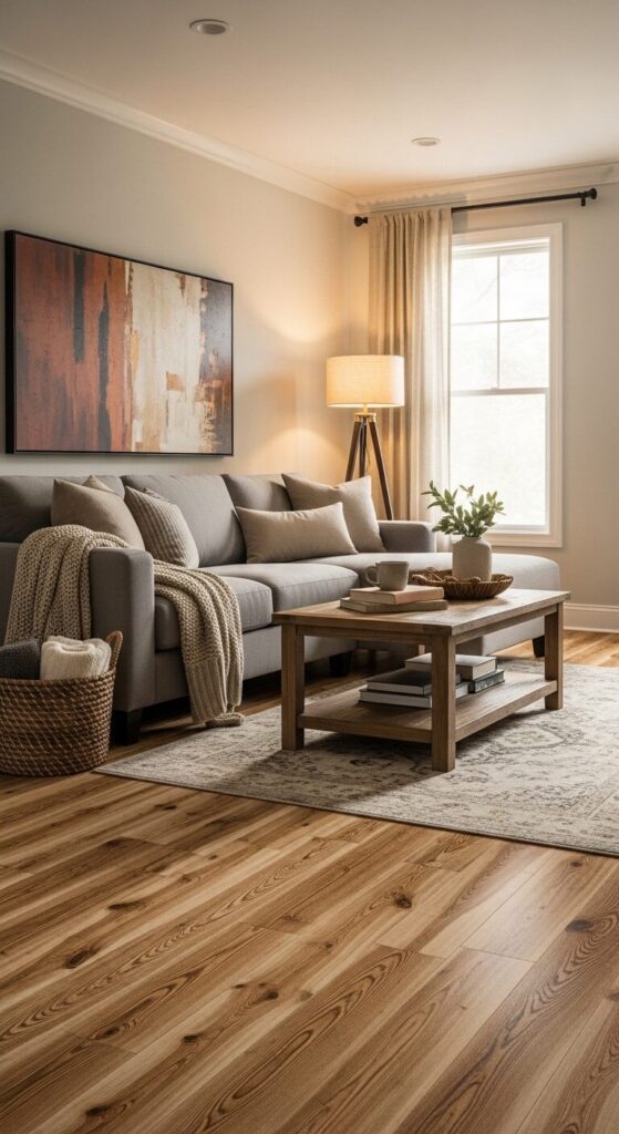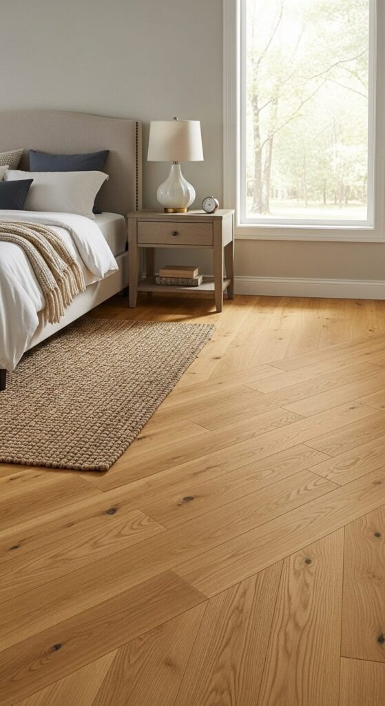How to Achieve This Look: Select white oak in its natural tone or with a light honey stain. Opt for wider planks (8-10 inches) and arrange furniture to let the flooring shine as a foundational element rather than covering it entirely with rugs.