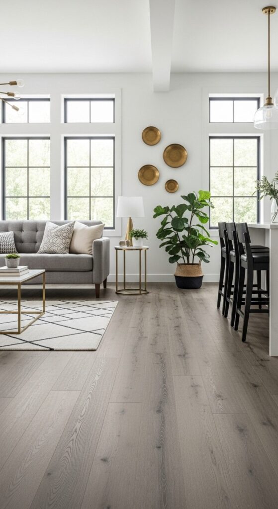 How to Style This Scene: Apply a gray wash or stain to oak flooring, keeping enough wood tone visible to maintain warmth.