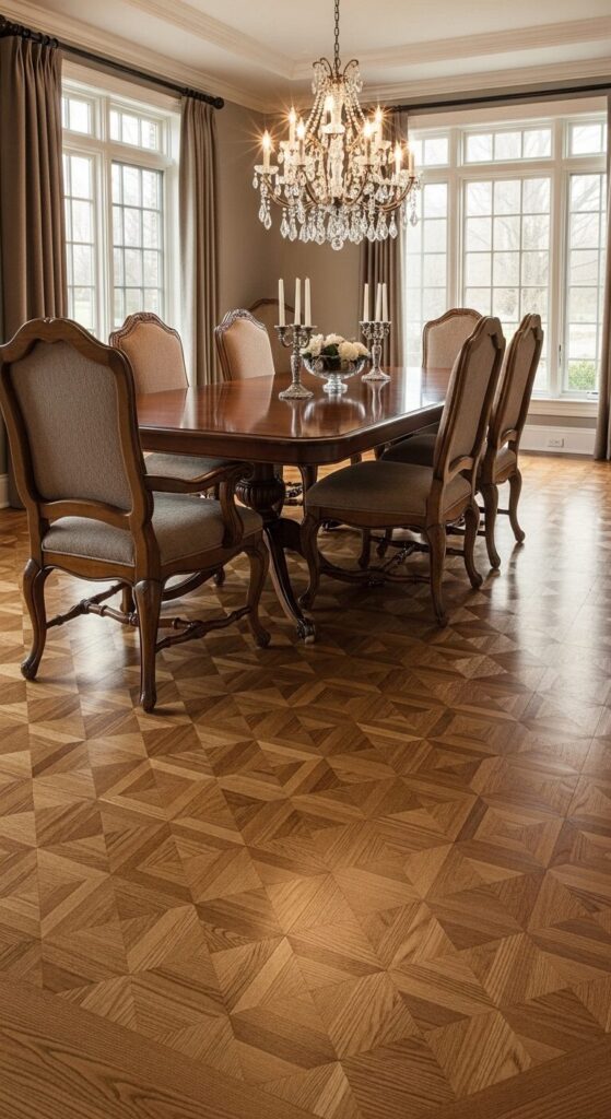 Small wood pieces arranged in intricate geometric patterns—squares, diamonds, or basketweave designs—transform your floor into functional art.