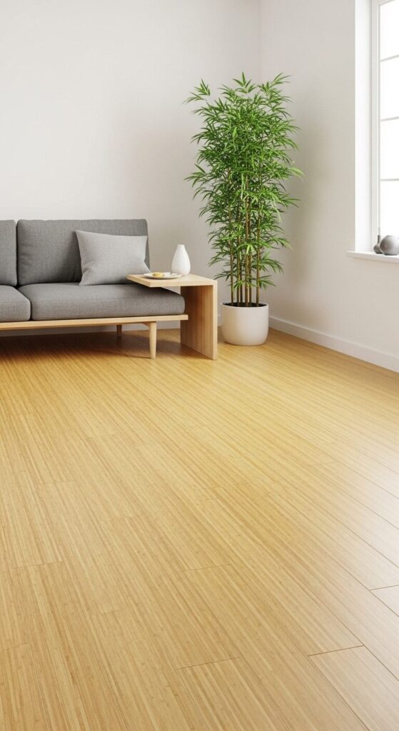 Pale, creamy bamboo flooring in blonde tones offers sustainable beauty with a smooth, contemporary aesthetic that’s distinctly different from traditional hardwood.