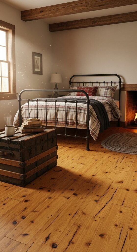 Soft golden pine boards dotted with dark knots, small cracks, and natural imperfections create a floor that celebrates wood’s organic character rather than hiding it.